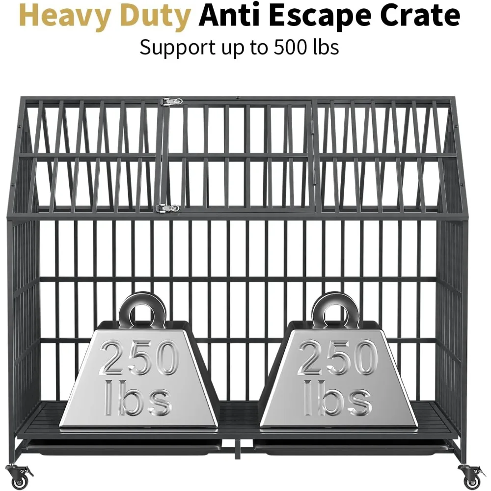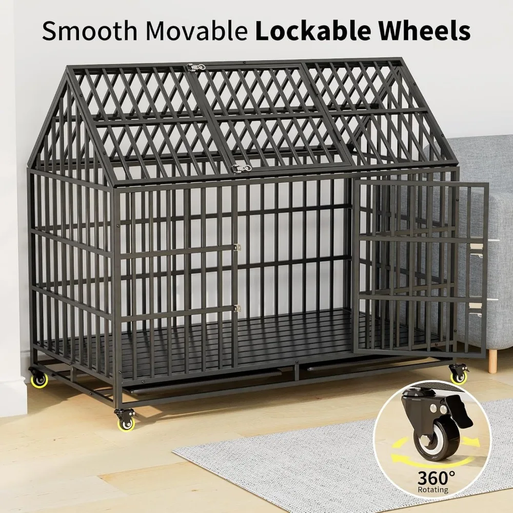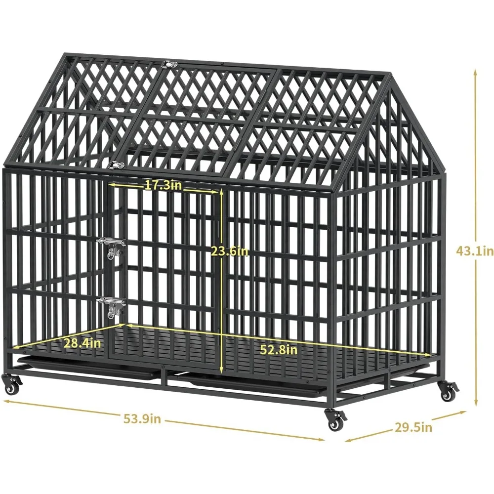 54 Inch Heavy Duty Dog Crate Extra Large Dog Cage Kennel, Indestructible XXL Dog Crate with Open Roof Top, Trays and Wheels, Esc