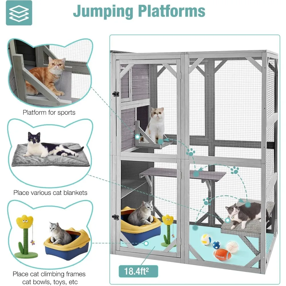 - Extra large outdoor cat house: The outdoor cat house includes a 4-story loft, 3 lounges, 5 windows (4 acrylic windows, 1 sliding window), and 3 platforms