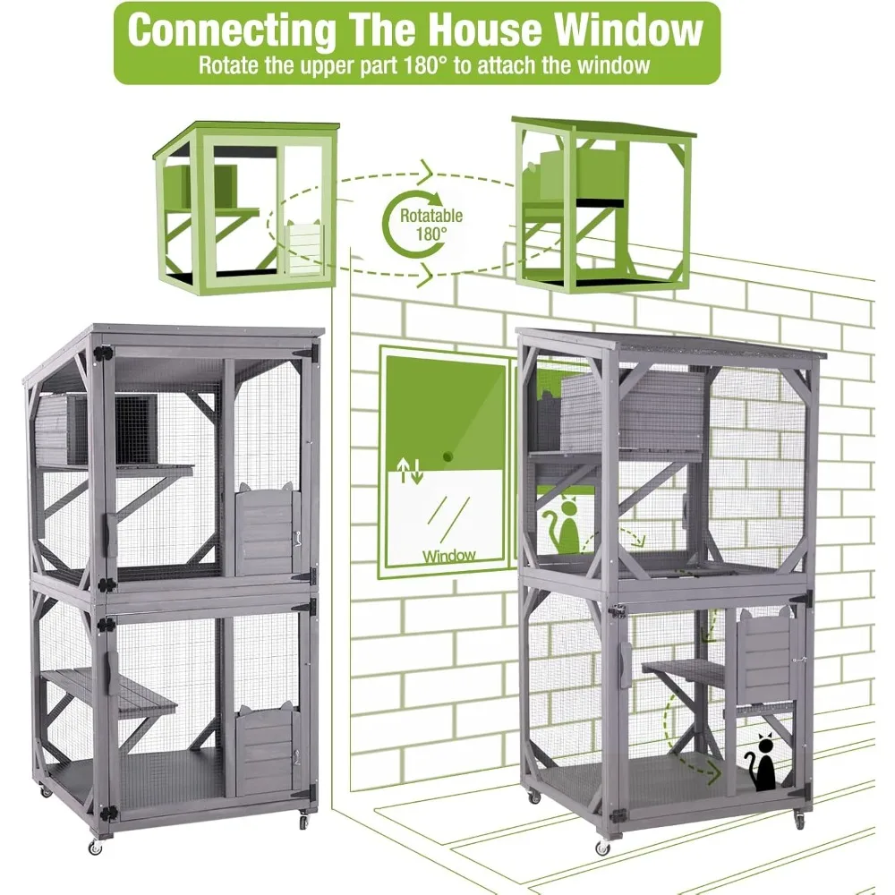 Cat House Outdoor Cage Cat Enclosure on Wheels,Large Wooden Kitty Catio with Resting Box,PVC Layer