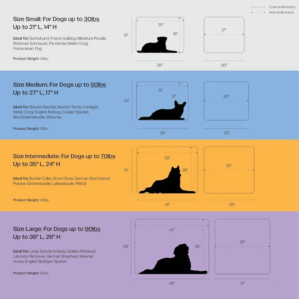 - INTERNAL DIMENSIONS: 39L x 28H x 25W, EXTERNAL DIMENSIONS: 41L x 31H x 28W, COLLAPSED DIMENSIONS: 45L x 13H x 28W, CRATE WEIGHT: 50lbs