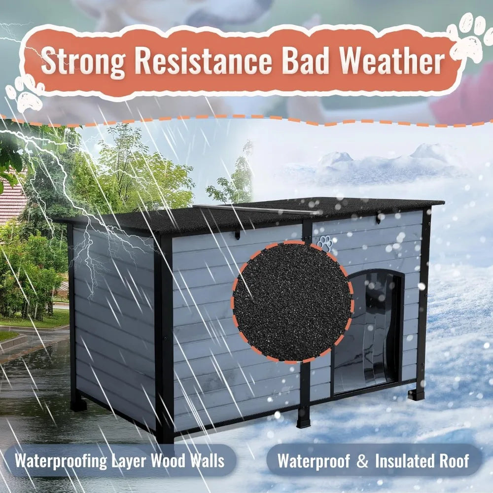- 【All-Weather Dog House Outdoor for Year-Round Protection:】Built with a sturdy fir wood frame, waterproof asphalt roof, and elevated floor with plastic foot pads, this dog house outdoor shields pets from rain, snow, and ground moisture. Features like weatherproof PVC door curtains ensure durability in any season, making it a reliable sanctuary in extreme conditions.