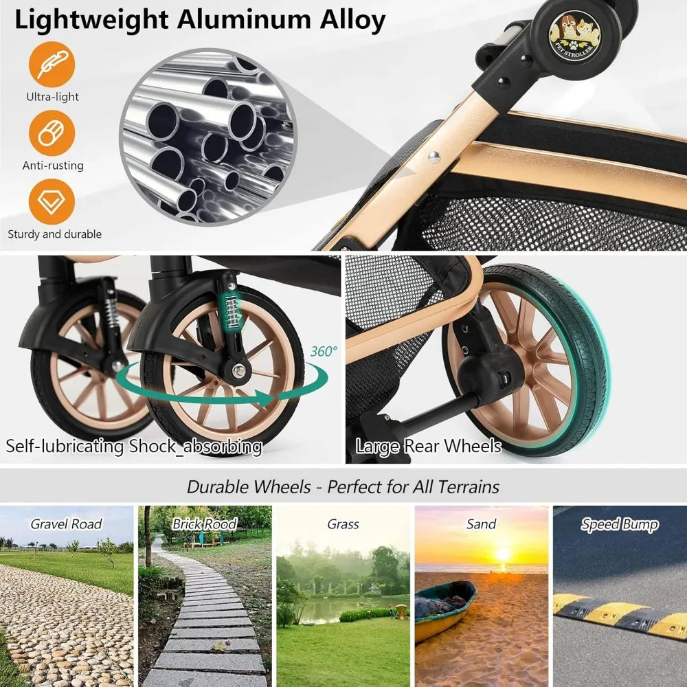 - 🐶😺【Luxury & Durability】: Crafted with a lightweight yet sturdy Aluminum Alloy frame. C510L dog stroller offers unparalleled stability. The frame and 10.5" large rubber back rear showcase a stylish gold finish for a touch of elegance. The stroller is equipped with a washable, removable 600D Oxford cloth liner for your pet's comfort and easy maintenance.
