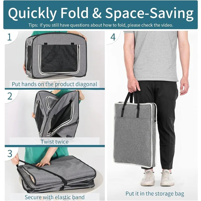- [Easy to Use and Portable] The lightweight Portable dog crate pops open for use, no assembly required. when not in use, you can twist it for quickly fold and insert into the included carrying case for easy storage and portability.